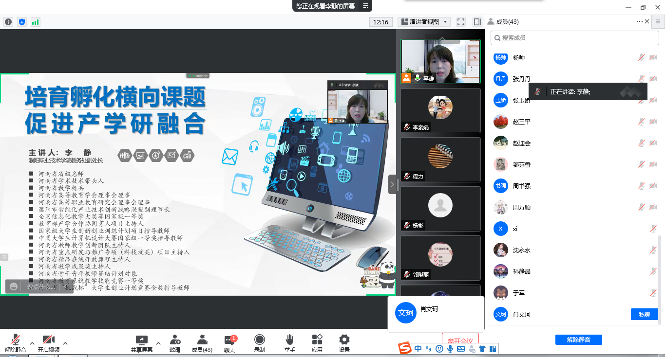 12月7日下午,大数据公司邀请濮阳职业技术公司教务处副处长李静通过线上腾讯会议作了以“培育孵化横向课题,促进产学研融合”为主题的精彩讲座。党总支书记奚建刚主持。
